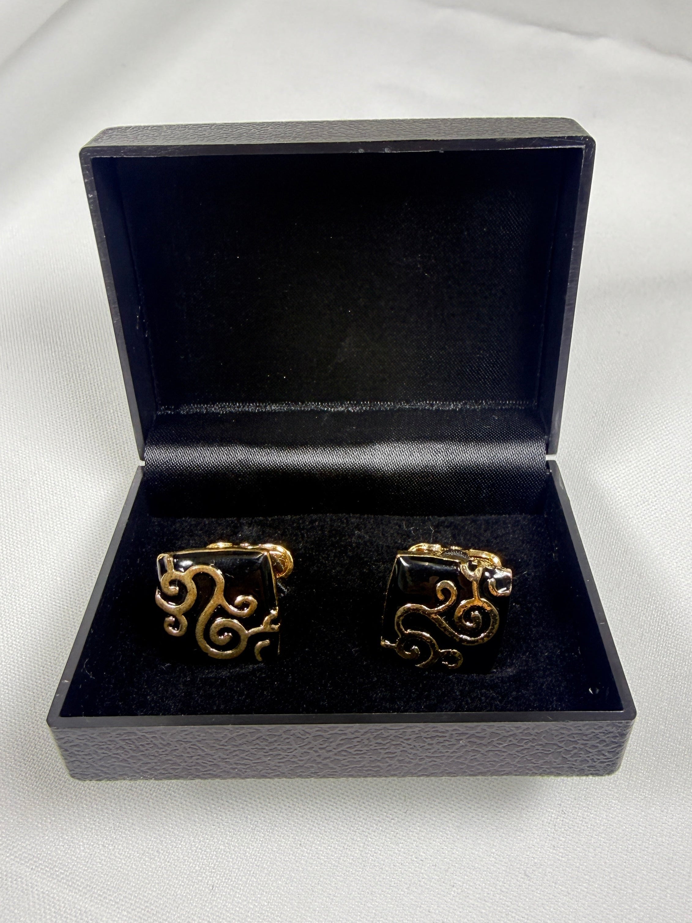 Ornate Gold-Tone Filigree & Black Enamel Cufflinks